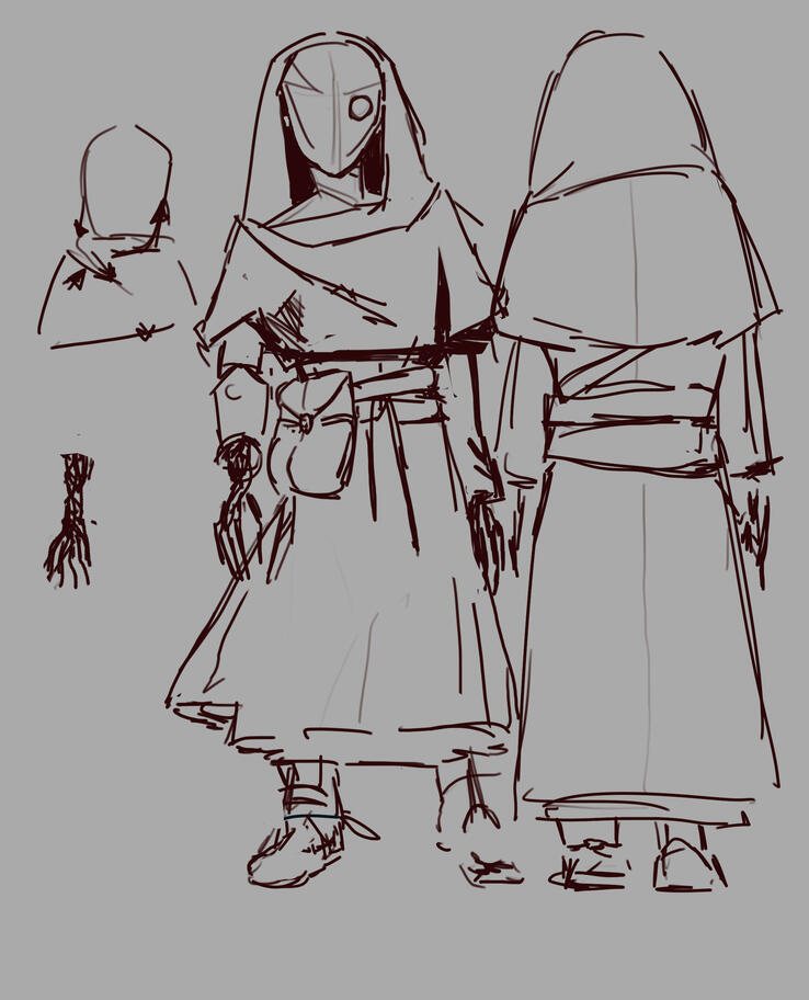 Now that I have the basics, it's time to make the character work as part of the world surrounding it. This particular character lives in a light fantasy world with sci-fi elements. For my next steps I'm looking for how robes are traditionally constructed, how these clothes are held on the body, as well as any other details I'm interested in adding. At this stage, I am looking to change my focus from basic to realistic, and part of this requires a bit of creative writing. Imagine the initial prompt is a description of the creature, and as the artist, you are an average person in this world/environment. To use the character here as an example, holding potions on his belt-loop is impractical, so it's been changed to a full bag. Small details like this add up; making characters who have to contend with the world they live in grounds them, and makes them fit.Reference refinement